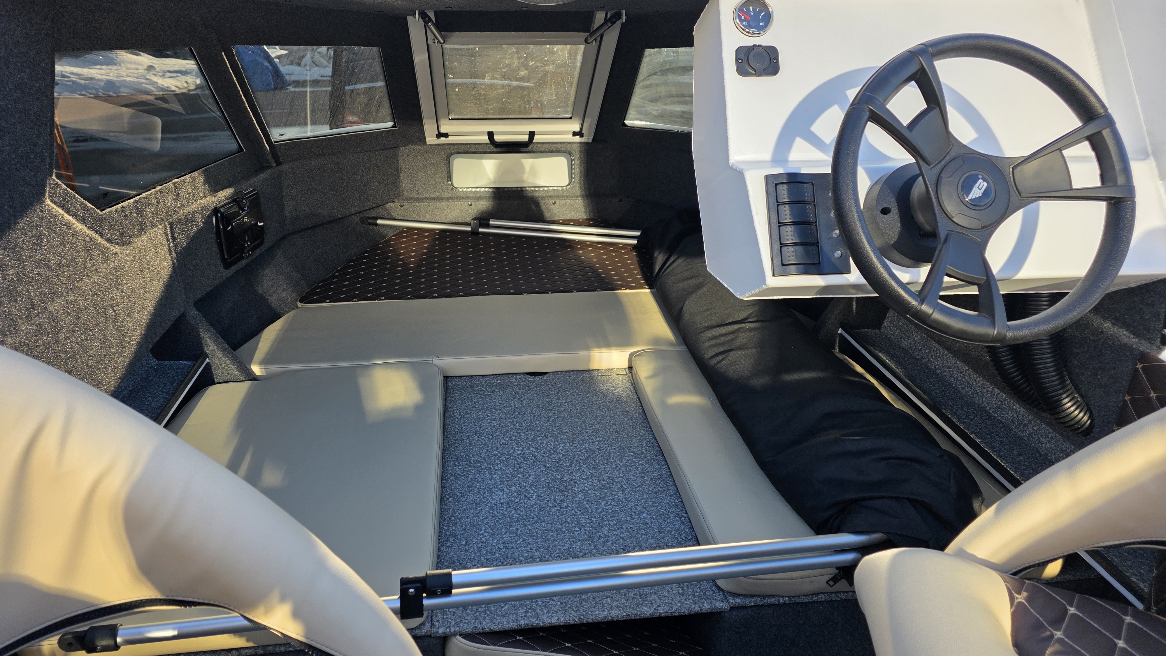 Отправляясь на длительные расстояния, в путешествие или на рыбалку, следует помнить, что погода может поменяться в любую минуту, а полурубка обеспечит все условия для комфорта. Лодка обладая лучшими скоростными и мореходными характеристиками в своем классе, доставит в место рыбалки и отдыха в максимально короткий срок. Добавим к этому высокий борт и достаточное место для припасов и сохранности пойманной рыбы, то получим — катер Беркут M-HT.