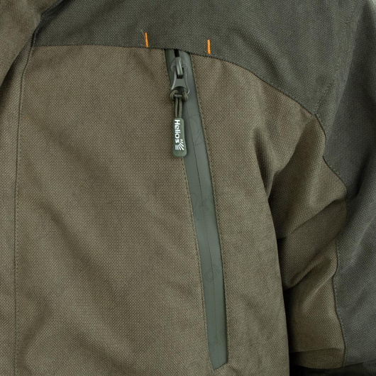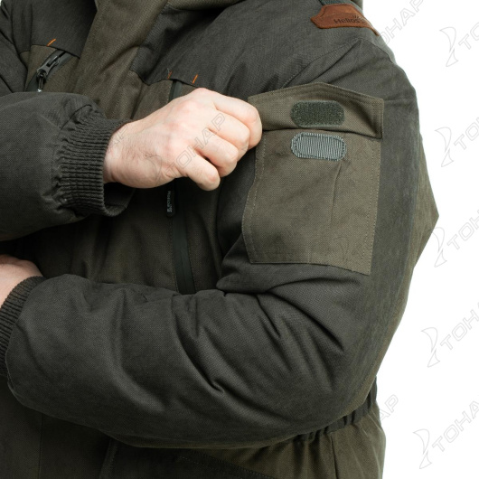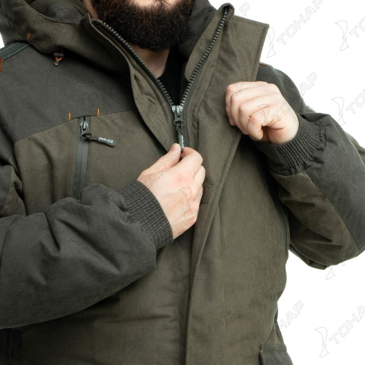 • Два боковых кармана с влагозащитной молнией, один нагрудный карман. Два накладных кармана с клапаном на магнитных кнопках для размещения нужного инвентаря (патронов и т.п.). Защита от холода и ветра