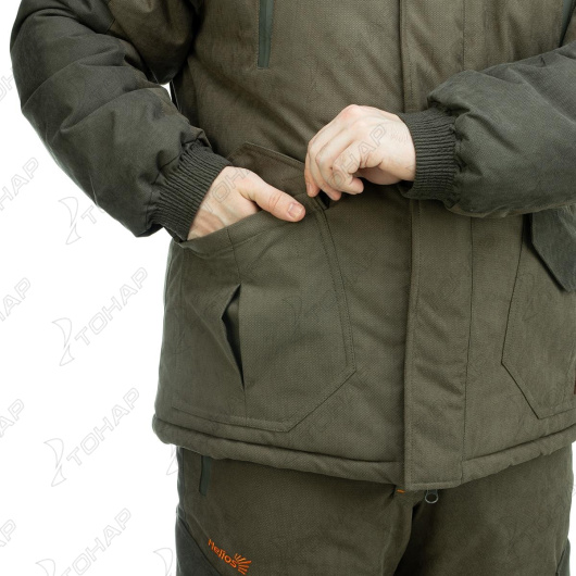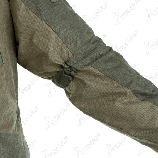 ХАРАКТЕРИСТИКИ Комплектация: Куртка, полукомбинезон, Сумка для хранения и переноски. Цвет: Хаки. Сезон: Зима. Комфортная температура эксплуатации: от-15°С до -45°С. Размер: международный 2XL (российский 52-54), рост 170-176. Материал верха: ткань Исландия (92% полиэстер, 8% нейлон) с водоотталкивающей пропиткой WR, TPU. Мембрана: мембрана FORTEX. Водонепроницаемость (мм в. ст.): 24 000. Паропроницаемость (г/м2/24ч): 17 000. Слойность мембраны: 2. Утеплитель: SHELTER SPORT (куртка - 350 гр/м2, рукава - 200 гр/м2, полукомбинезон - 200 гр/м2). Подкладка: утепляющий слой из флиса 130г/м2 на зонах спины и груди. Гладкая ткань Taffeta 210Т, используется в рукавах, по низу куртки и в полукомбинезоне для комфортного одевания. Состав: 100% полиэстер. Использование: Охота, Рыбалка, Активный отдых. Награды: - Производитель: ТОНАР, Россия.