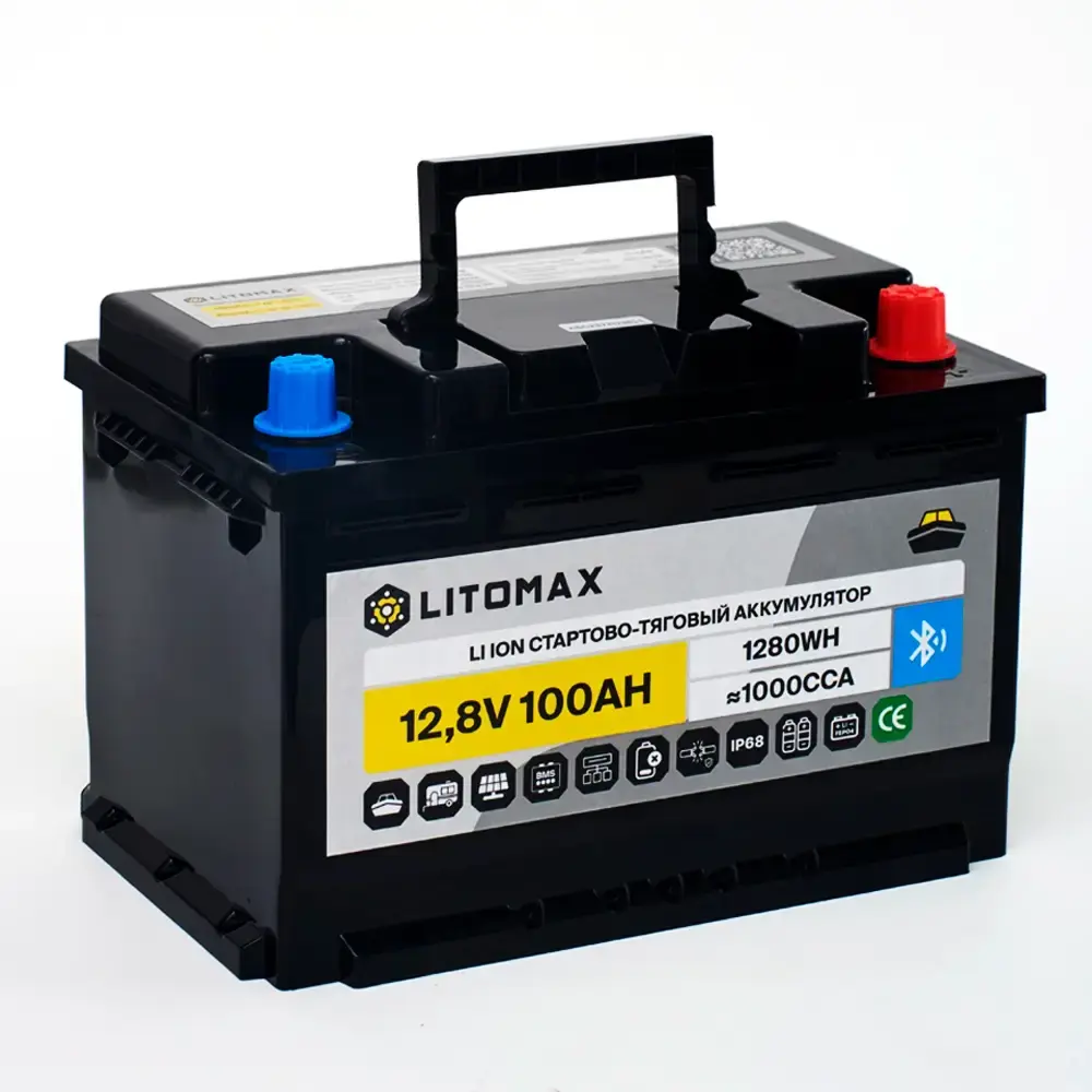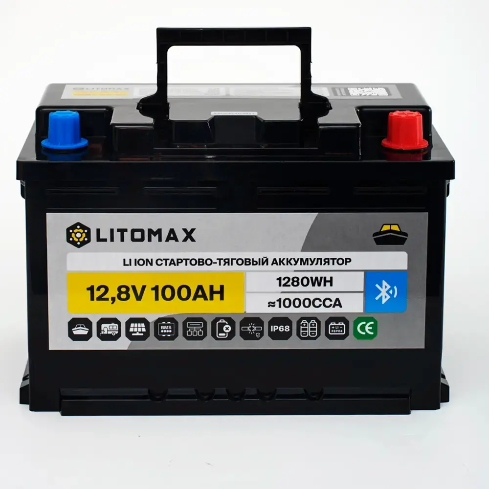Литиевый аккумулятор LITOMAX LiFePO4 12V 100Ah 1280Wh 1000CCA — идеально подходит для запуска двигателей и одновременно является тяговым аккумулятором глубокого цикла. Не рекомендуется применение в автомобилях с интеллектуальной системой зарядки аккумулятора.