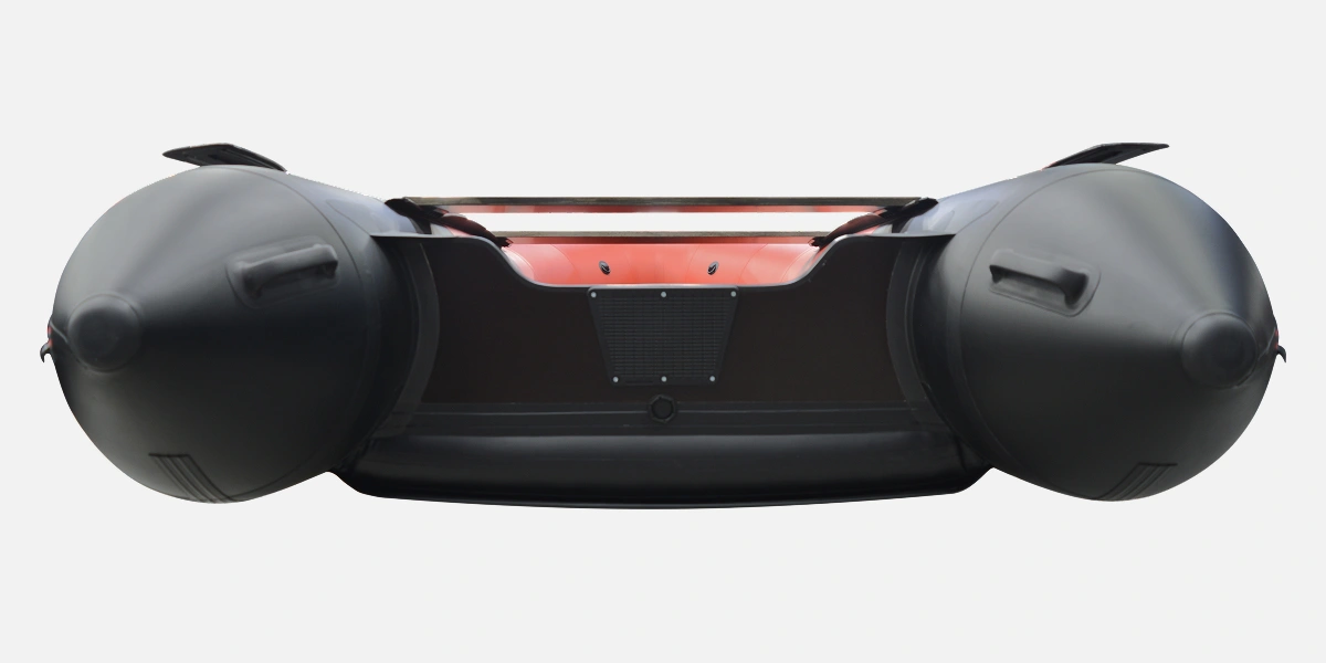 Транец лодок серии ПРО изготовлен из ламинированной водостойкой фанеры, толщиной 34 мм. На транце со стороны кокпита установлена пластиковая накладка под мотор, с внешней стороны транца установлена деревянная накладка. Также на транце надувной лодки установлен сливной клапан.