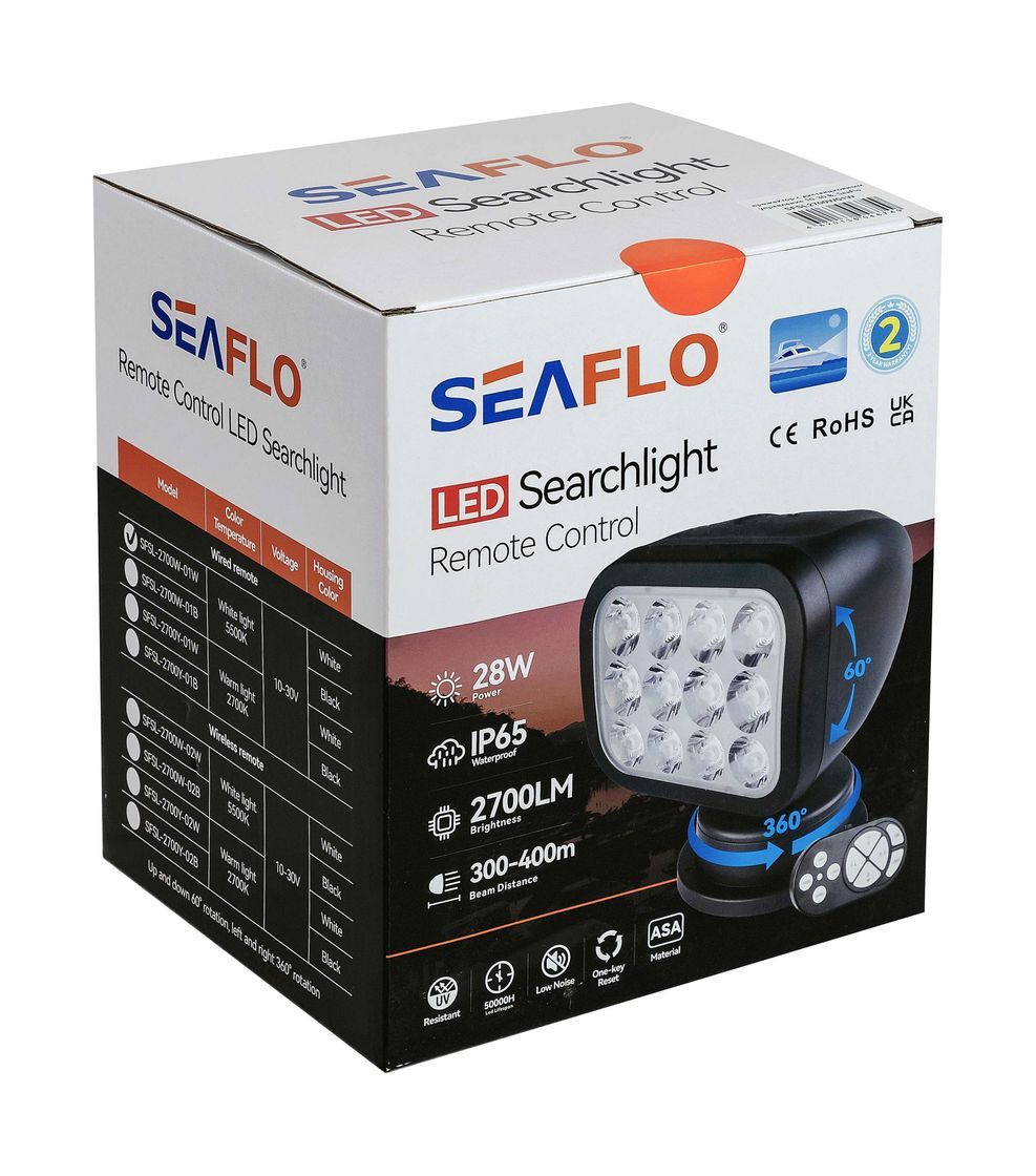 Прожекторы SEAFLO могут выполнять задачи по освещению местности в разных направлениях, под разными углами и на больших расстояниях. Он может вращаться на 360 градусов по горизонтали и на 60 градусов по вертикали. Управление осуществляется с помощью удобного пульта дистанционного управления.
