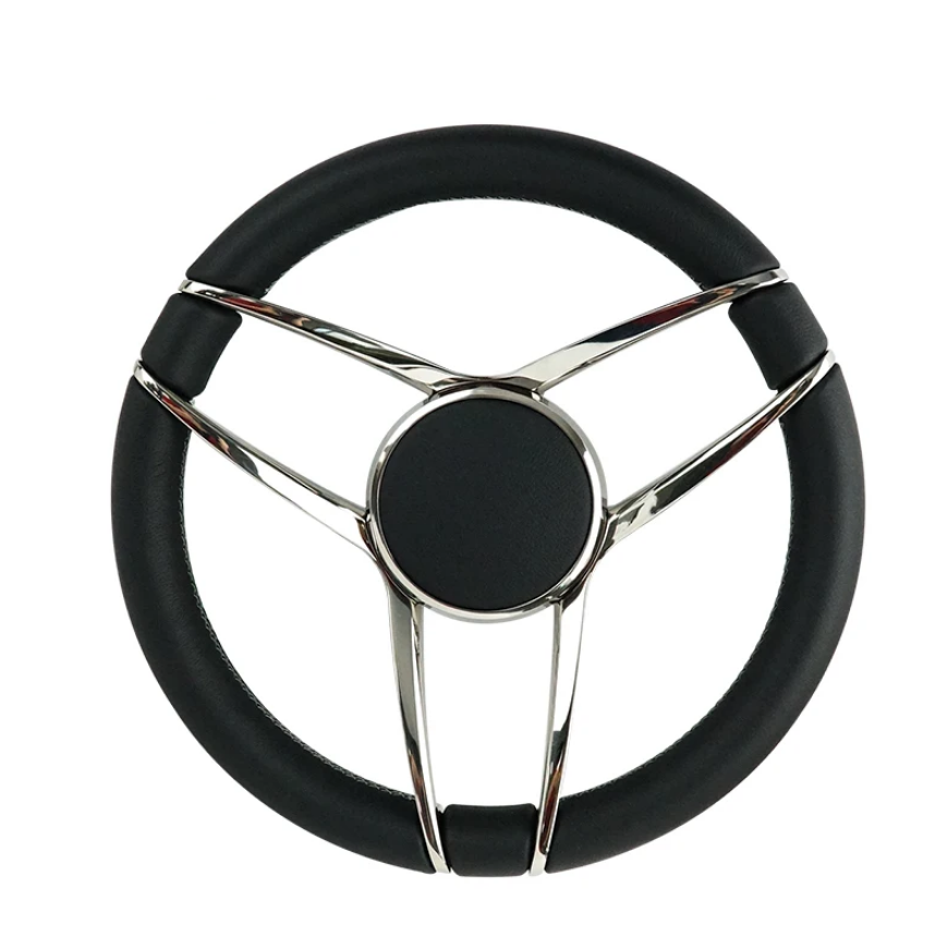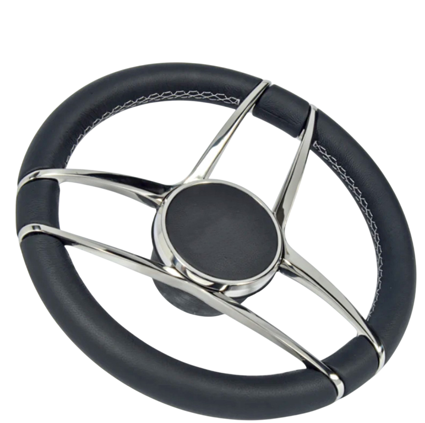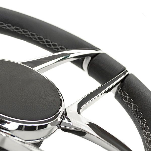 Рулевое колесо из полированной нержавеющей стали с обшивкой из натуральной кожи черного цвета.