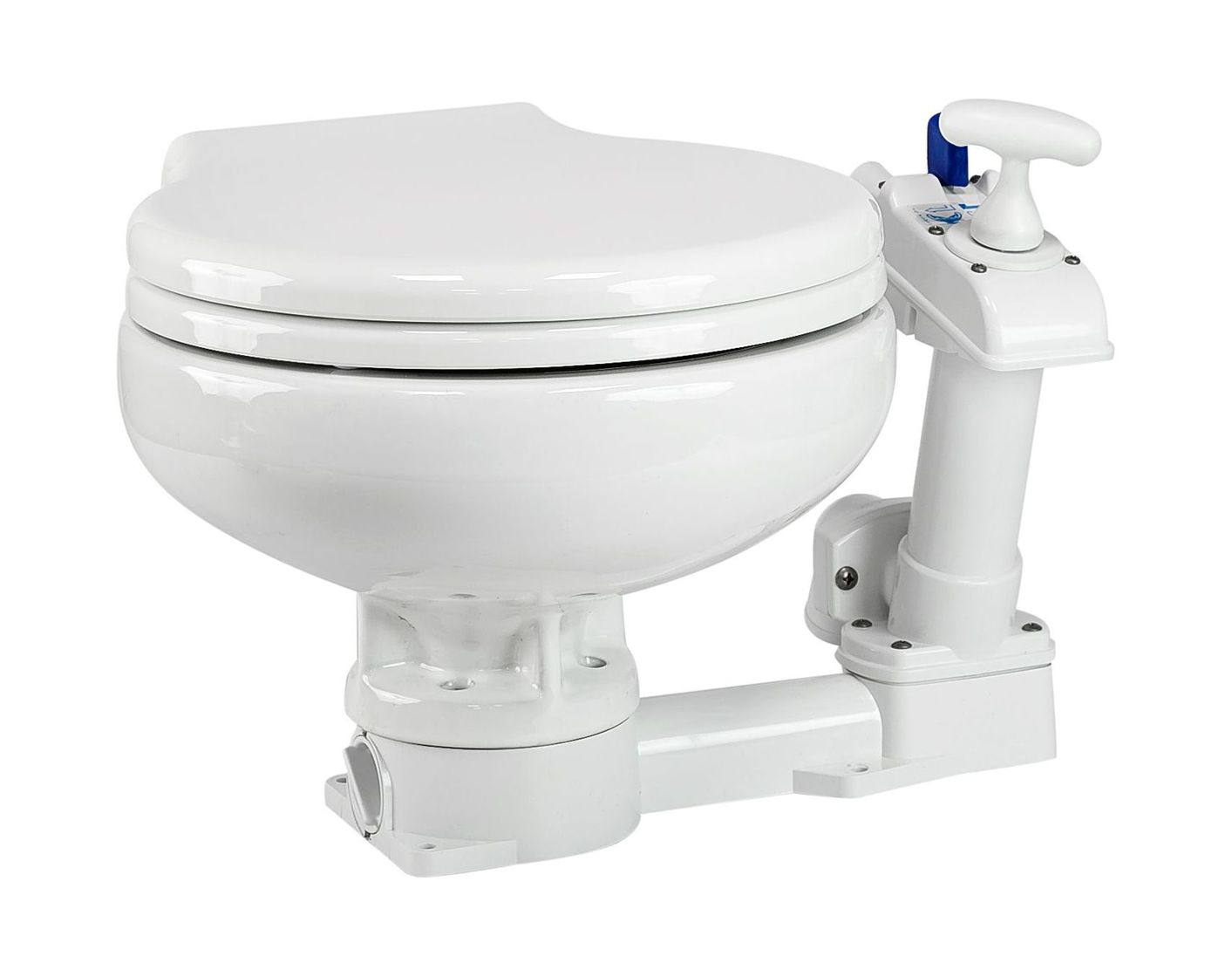Судовой компактный унитаз с ручной прокачкой. Самовсасывающий насос обеспечивает смыв и ополаскивание. Может устанавливаться выше или ниже ватерлинии при условии установки дополнительного вакуум-вентиля. Подходит для судов необорудованных бортовой электрической проводкой.