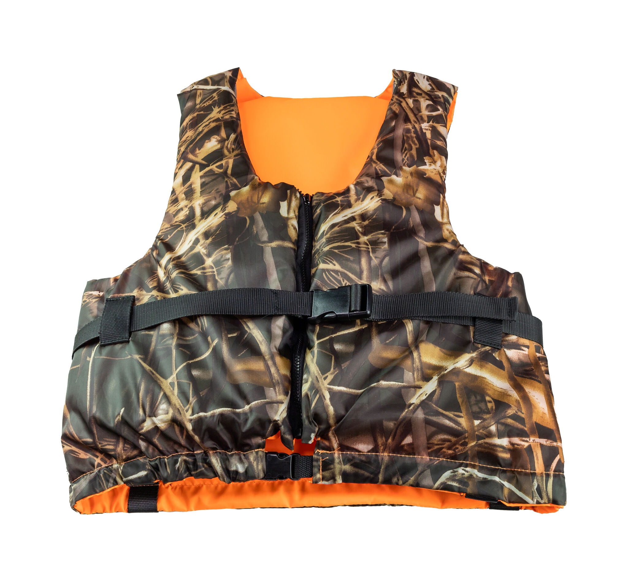 Жилет "Хамелеон" С лицевой стороны жилет ярко-оранжевый, если вывернуть в обратную сторону - камуфляжный. Застегивается жилет на замок-молнию и ремень с фастексами. Для хорошей видимости в темное время суток на плечах расположены светоотражающие полосы. Жилет предназначен для рыбалки, охоты и работ на судах. Карманов, свистка и воротника нет.